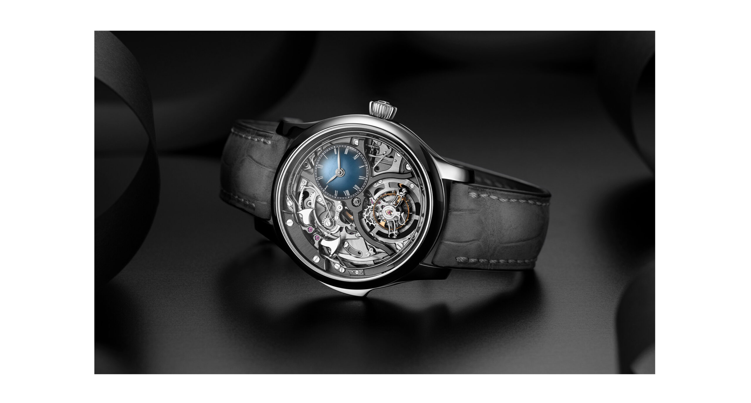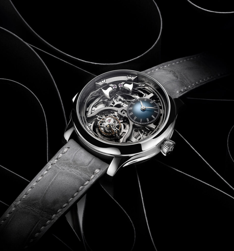 この時計を駆動するのは自社製手巻きキャリバー HMC 909。全面的にスケルトン化され、立体構造を備えています。400 個以上の部品が組み込まれており、ミニッツリピーターとフライング トゥールビヨンをひとつの構造の中に収め、その複雑な機構は遮るものなく存分に眺めることができます。約 90 時間のパワーリザーブを誇り、手作業により仕上げと装飾が施されたこのキャリバーは、伝統的な時計製造を極限まで追求した姿を体現しています。