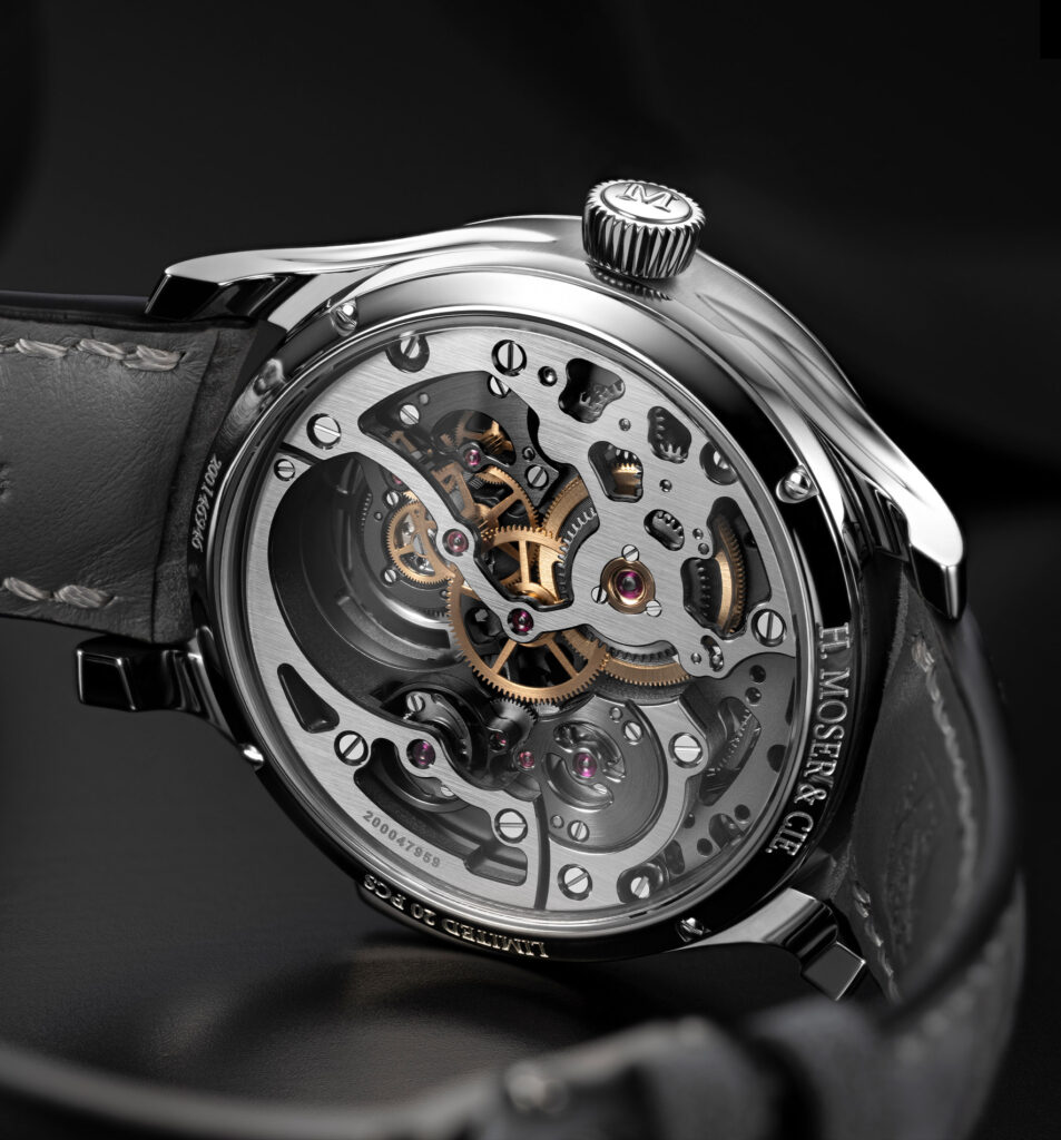 エンデバー・ミニッツリピーター シリンドリカル トゥールビヨン スケルトンにより、H. モーザーは時計製造において最も高度な 3 つの要素であるフルスケルトン構造、ダイアル側に配置したミニッツリピーター、円筒形のひげゼンマイを備えたフライング トゥールビヨンをひとつに融合させました。それぞれが単体でも極めて複雑な機構ですが、それらが一つになることで、音、動き、構造の相互作用が際立つ唯一無二の時計が生まれました。